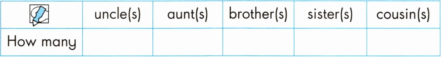 | | uncle(s) | aunt(s) | brother(s) | sister(s) | cousin(s) |