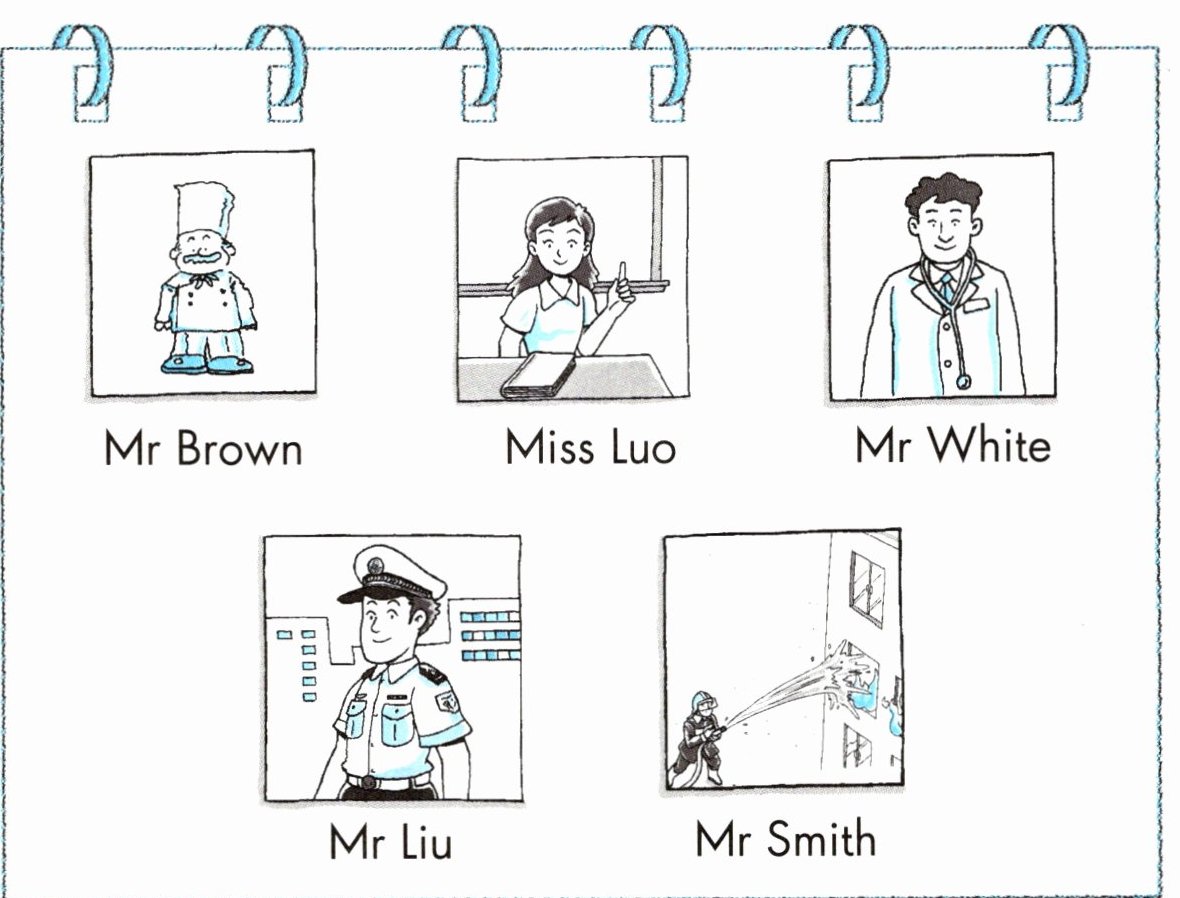 F Look, read and write (看图读一读,写出下面各段所描述的人物名字和他们的职业)