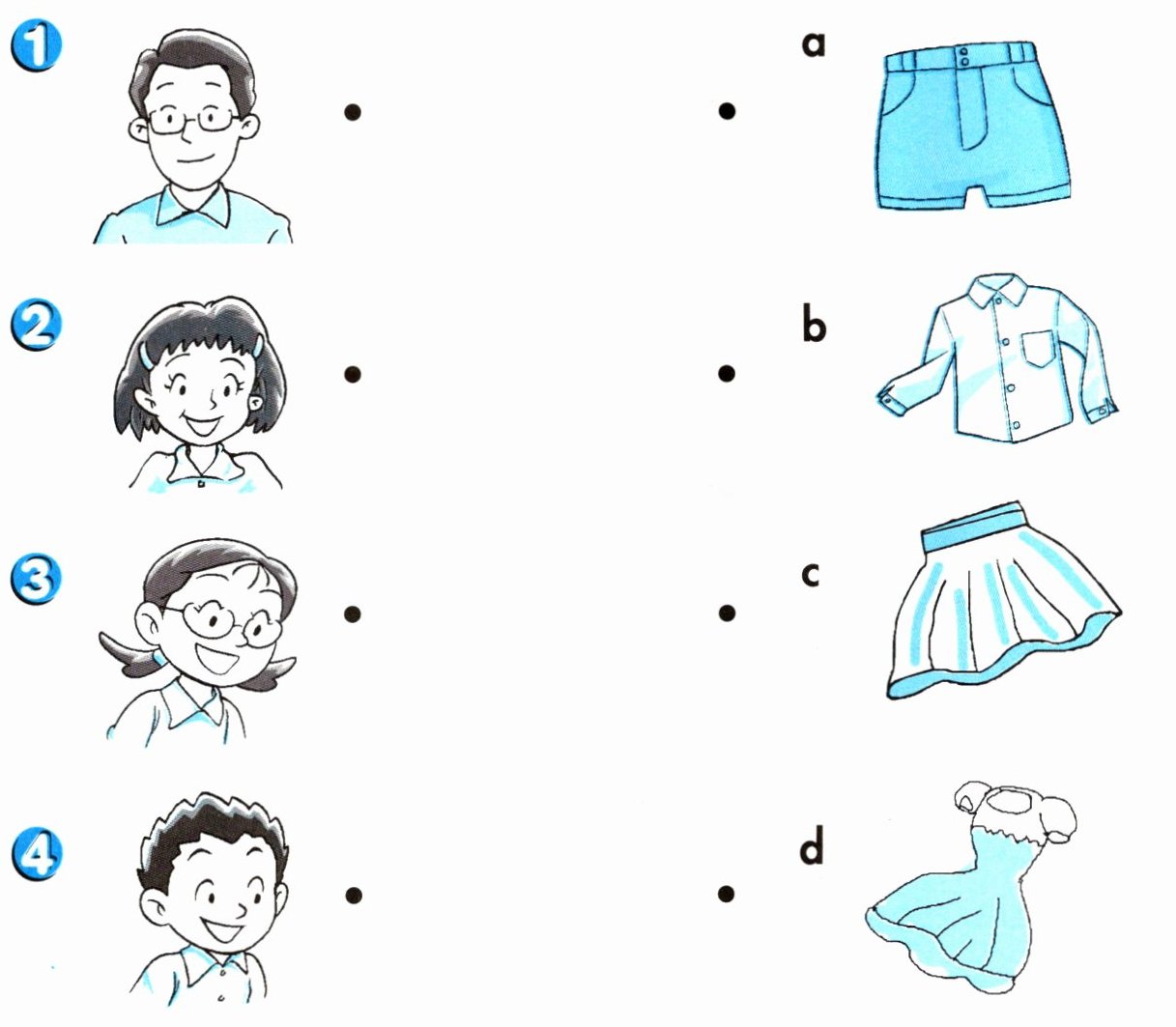 3. a pink shorts b green skirts c blue shirts