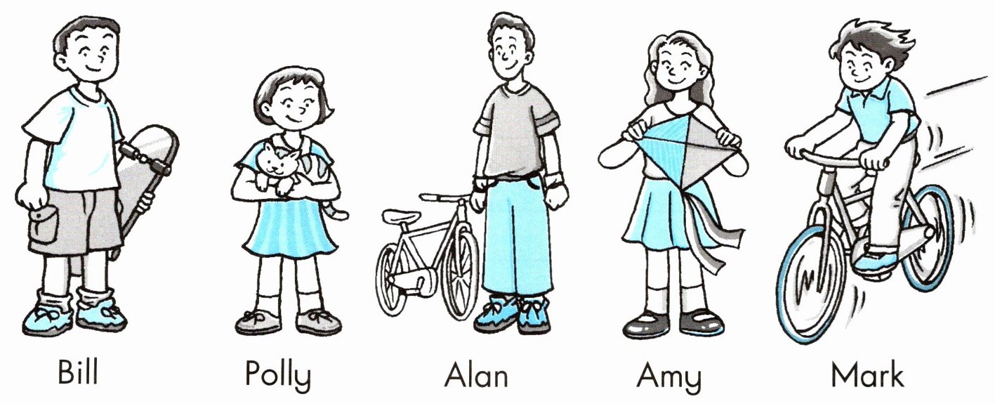 G Look, read and write(看图读一读,把相应的人物名字和物品名称写在横线上)