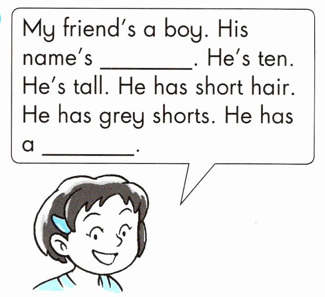 3. My friend's a boy. His name's ______. He's ten. He's tall. He has short hair. He has grey shorts. He has a ______.