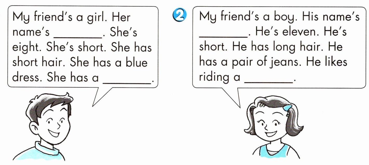 2. My friend's a boy. His name's Mark. He's eleven. He's short. He has long hair. He has a pair of jeans. He likes riding a bicycle.