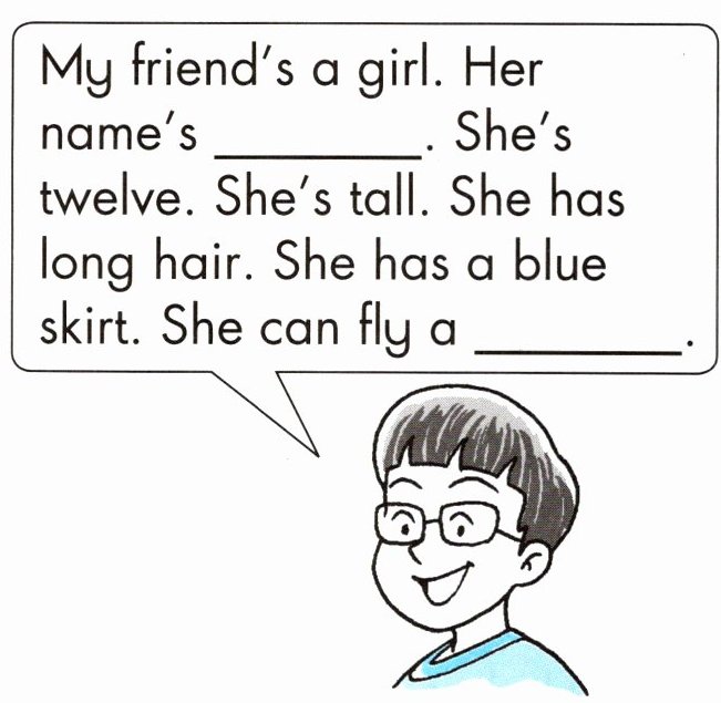 4. My friend's a girl. Her name's ______. She's twelve. She's tall. She has long hair. She has a blue skirt. She can fly a ______.