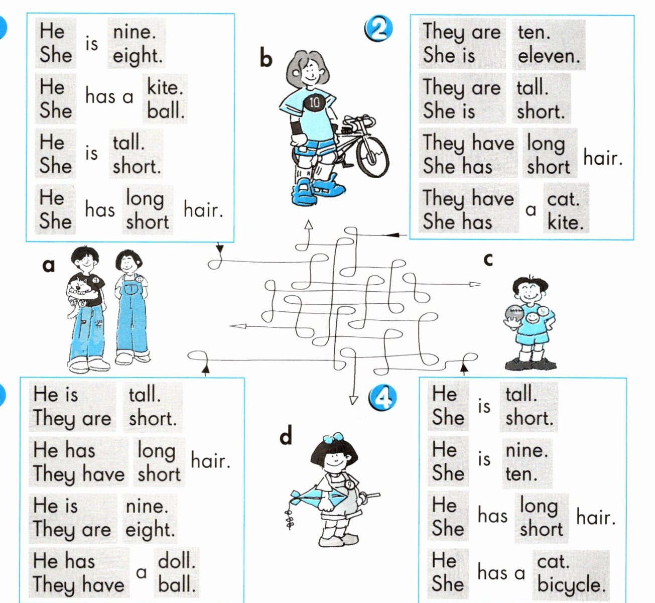 3-c: He is nine; He is short; He has short hair; He has a ball