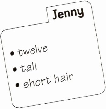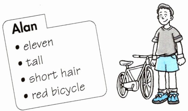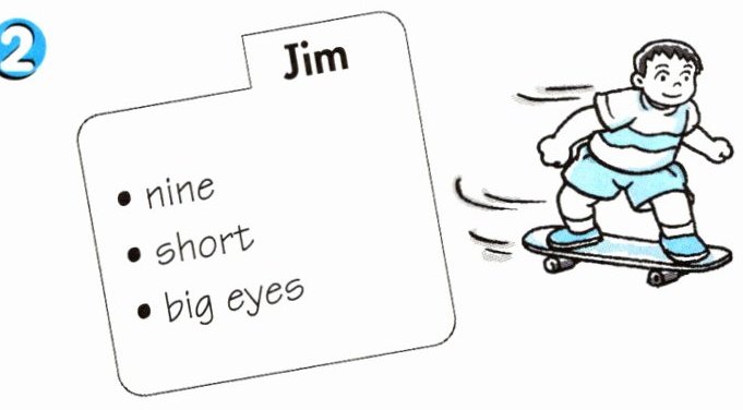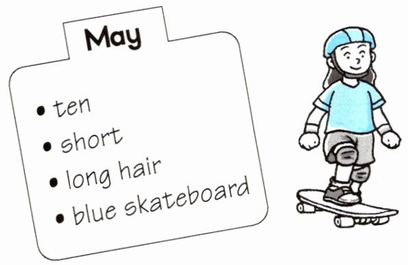 ①Her name; She's; She's; short ②This is; His name; He's; He's; big ③His name; He's; He's; is short; His; red ④She's ten (years old). She's short. Her hair is long. Her skateboard is blue.
