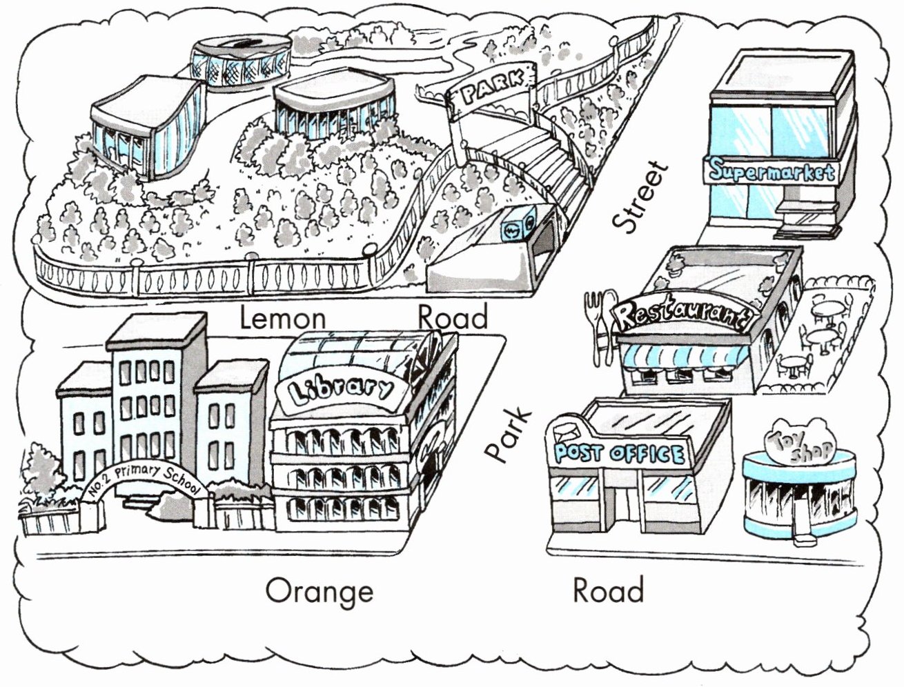 I'm Jim. My ______ is at No.10 Apple ______. There are some ______, a supermarket and a ______ ______ on the street. My ______ is at No.40 Tree Street. There is a ______ behind my school. I like playing there. Next to the park, there is a toy shop and a ______. There is a ______ next to the toy shop. I like reading books in it.