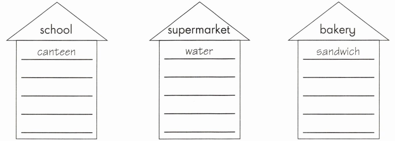 E Think and write (想一想,在这些场所你能看见什么?根据提示在每条横线上写一种)
