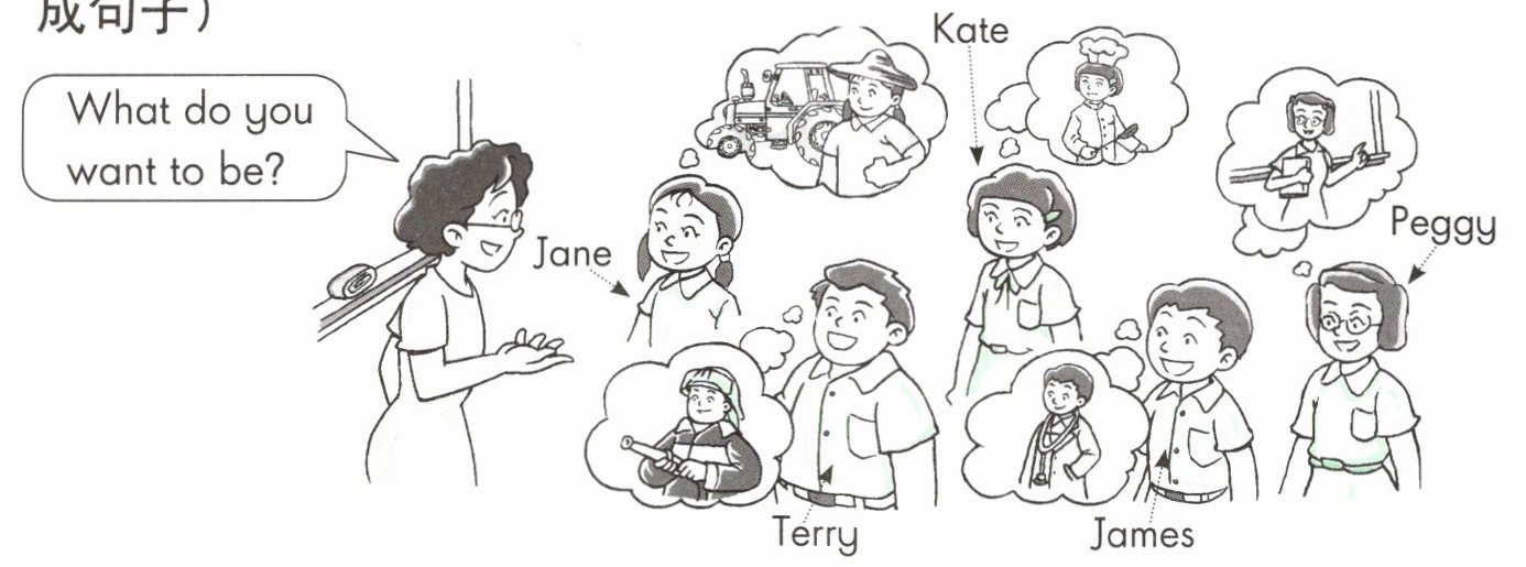 F Look and write(看图,选择适当的词组,仿照例句填空完成句子)