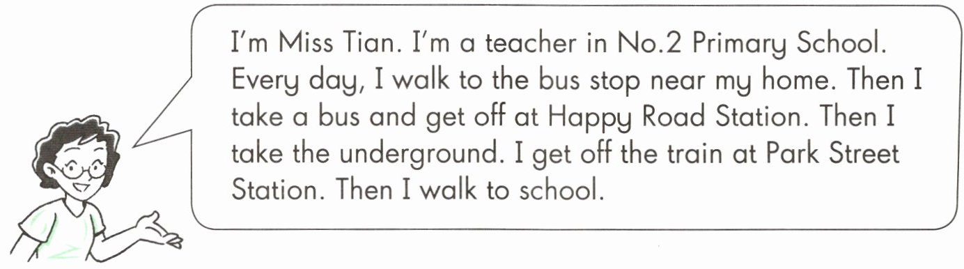 I’m Miss Tian. I’m a teacher in No.2 Primary School. Every day, I walk to the bus stop near my home. Then I take a bus and get off at Happy Road Station. Then I take the underground. I get off the train at Park Street Station. Then I walk to school.
