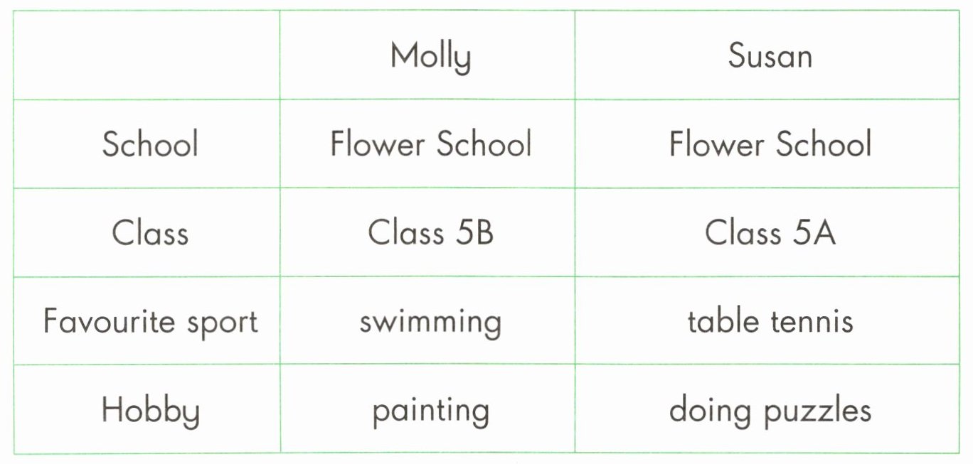 Molly and Susan are good friends. They're both at Flower School. They're in different classes. Molly is in Class 5B. Susan is in Class 5A. They both like sports. Molly likes swimming. Susan likes table tennis. They have different hobbies. Molly likes painting. Susan likes doing puzzles.