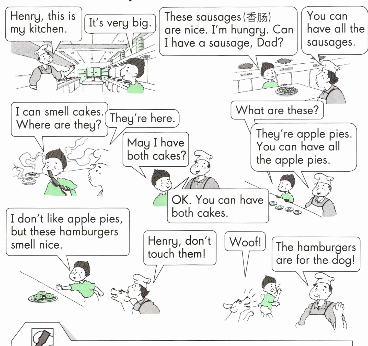 Henry is in his father's ______. His father is a ______. The kitchen is very big. Henry sees some sausages, two ______ and some ______ ______. He is hungry. He eats ______ the sausages and ______ of the cakes. He does not like apple pies. Then he sees some ______. He wants to eat them too. A dog comes and barks (吠) at him. It is ______. The hamburgers are for the dog.