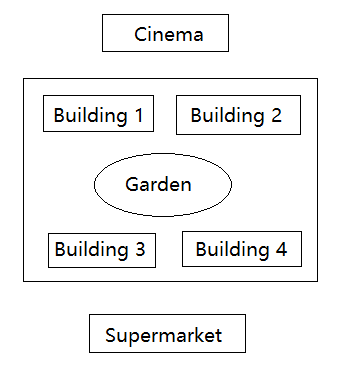 You can see four buildings, a garden, a cinema and a supermarket.