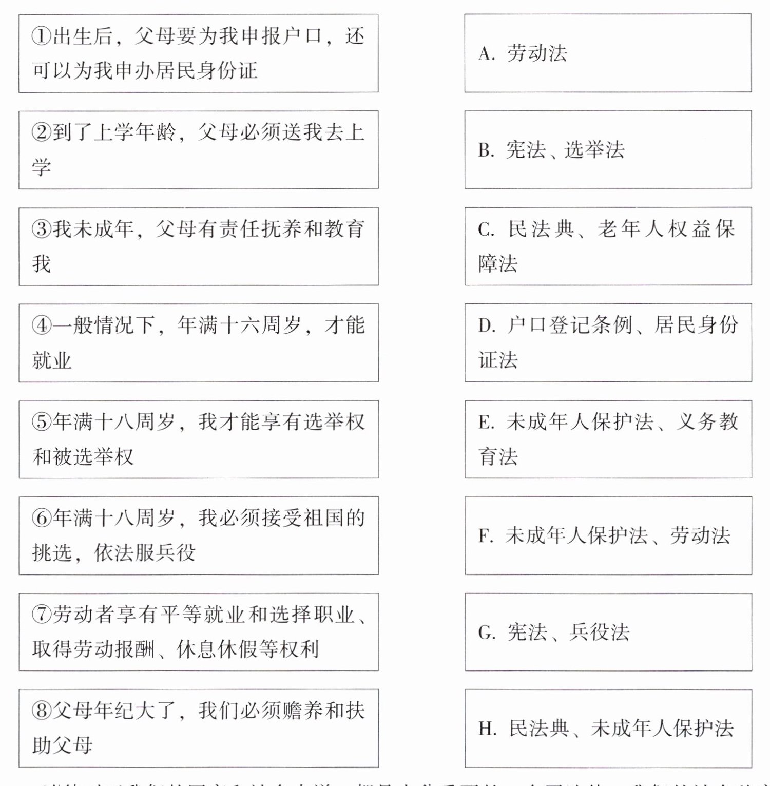 |⑥年满十八周岁,我必须接受祖国的挑选,依法服兵役|F. 未成年人保护法、劳动法|