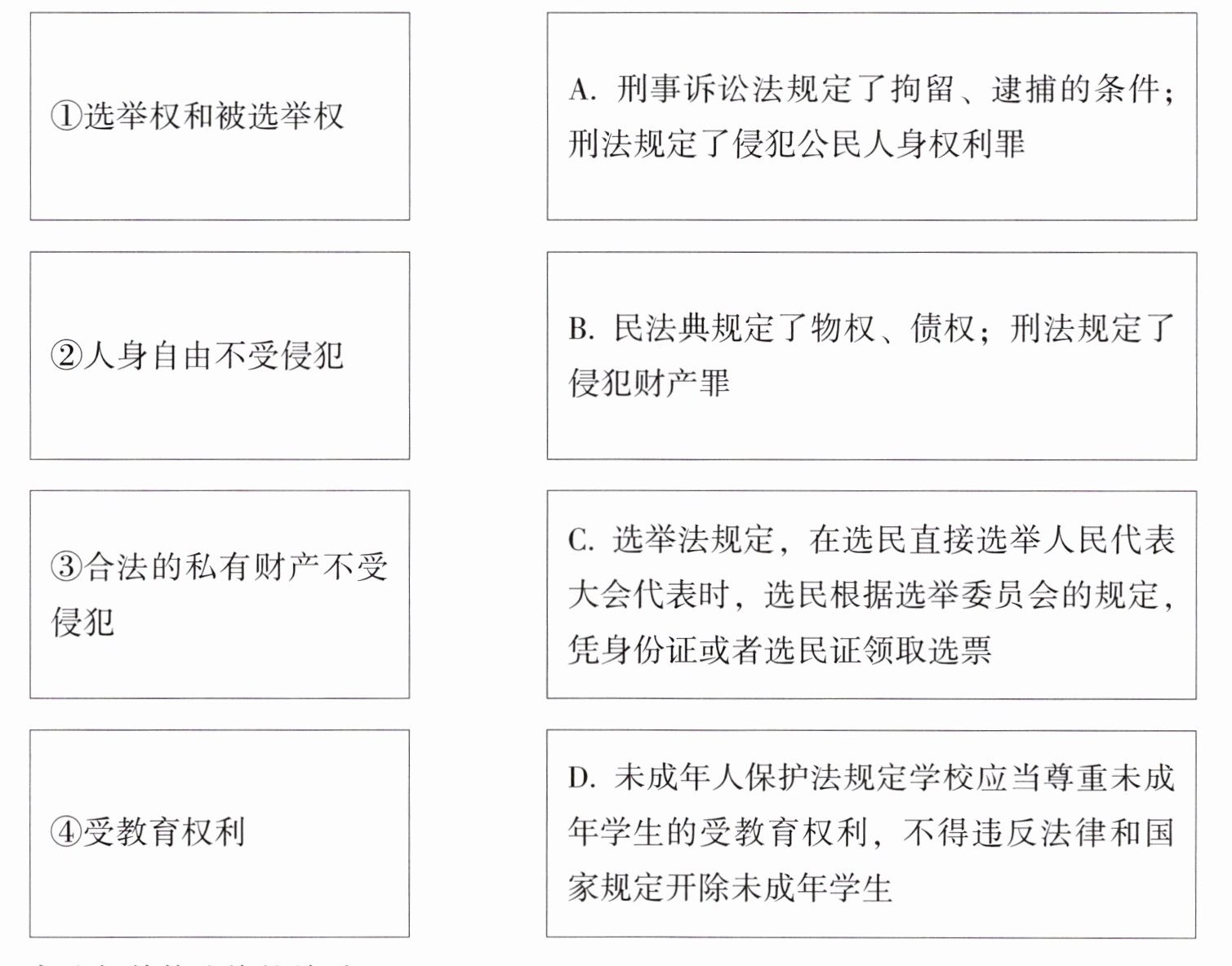 4. 请将下列宪法规定的公民所享有的权利和其他法律的相关规定进行连线,说明宪法与其他法律的关系。