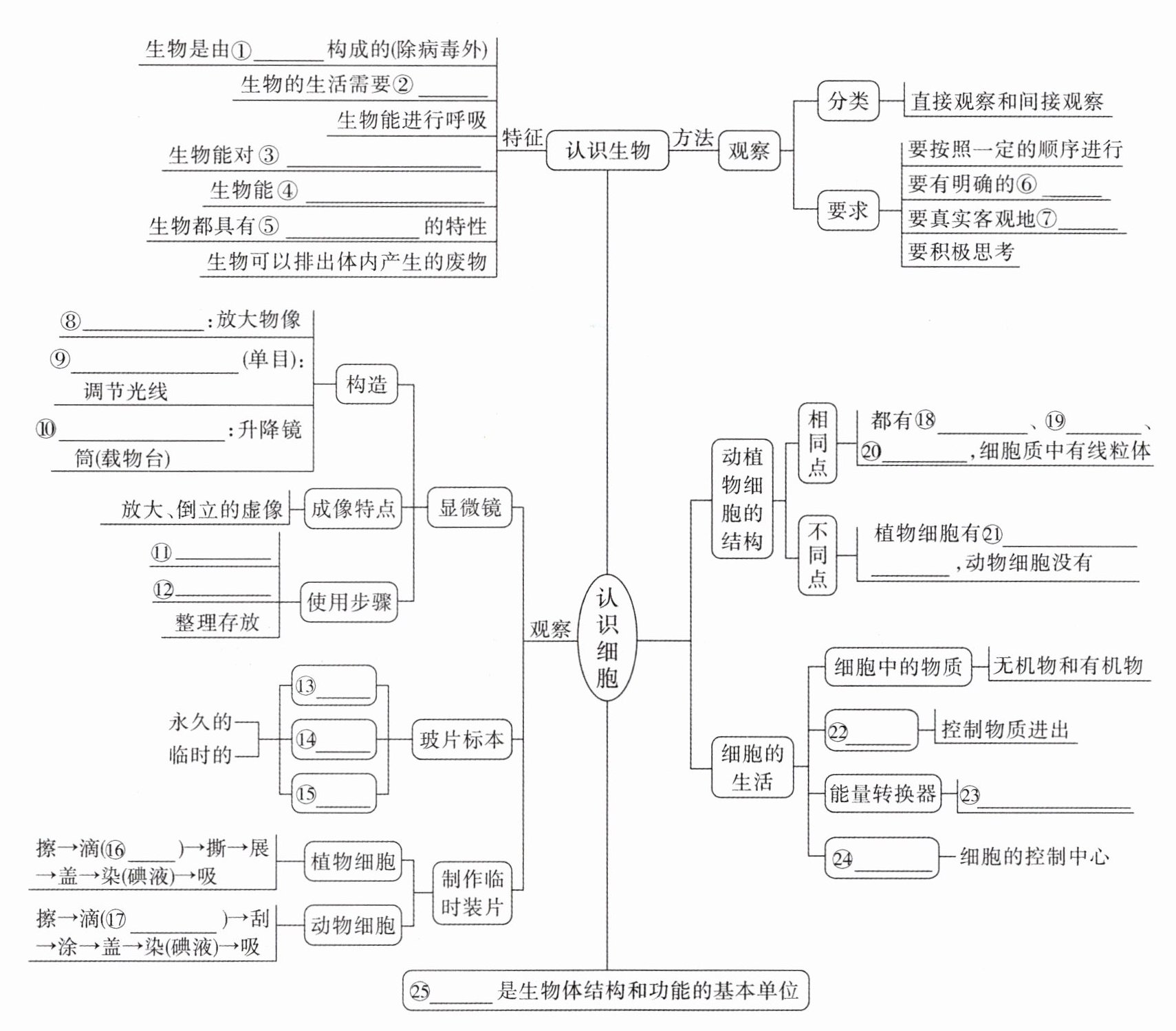 ①细胞 ②营养 ③外界刺激作出反应 ④生长、发育和繁殖 ⑤遗传和变异 ⑧目镜和物镜 ⑨遮光器和反光镜 ⑩粗、细准焦螺旋 ⑪对光调光 ⑫调焦观察 ⑱细胞膜 ⑲细胞质 ⑳细胞核 ㉑细胞壁、叶绿体和液泡 ㉒细胞膜 ㉓线粒体和叶绿体 ㉔细胞核 ㉕细胞