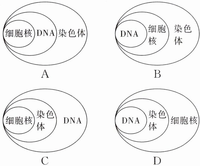 7. 下列图解中正确表示细胞核、染色体、DNA之间层次关系的是(
