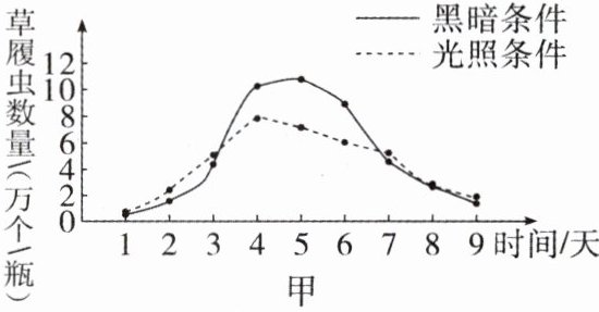 甲:横坐标为时间/天,纵坐标为草履虫数量(万个/瓶),实线表示黑暗条件,虚线表示光照条件。