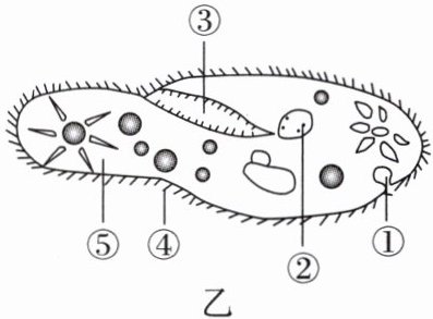 乙:草履虫结构图,①②③④⑤分别指向不同结构。