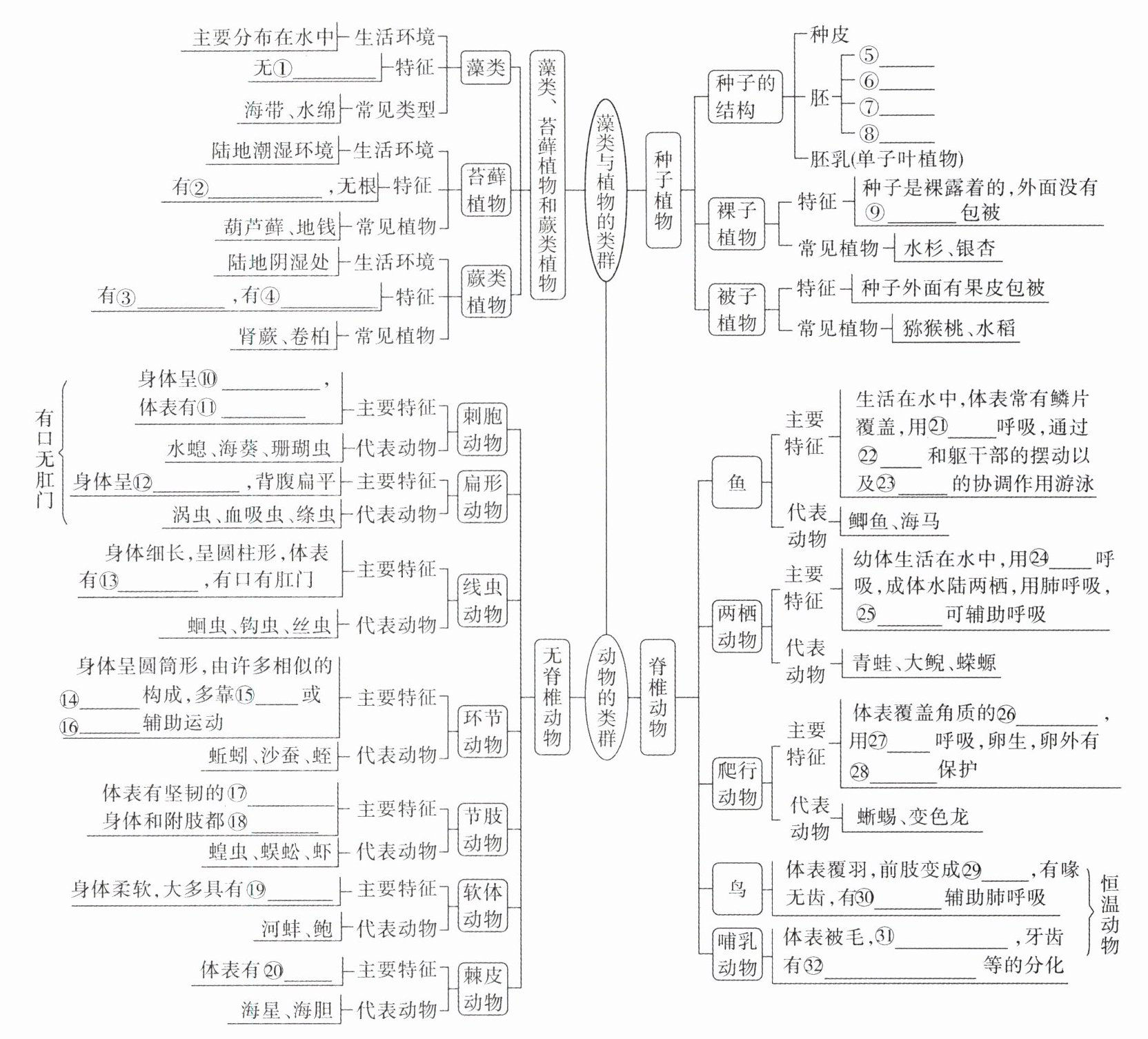 ①根、茎、叶 ②“茎”和“叶” ③根、茎、叶 ④输导组织 ⑤胚根 ⑥胚轴 ⑦胚芽 ⑧子叶 ⑨果皮 ⑩辐射对称 ⑪刺细胞 ⑫两侧对称 ⑬角质层 ⑭体节 ⑮刚毛 ⑯疣足 ⑰外骨骼 ⑱分节 ⑲贝壳 ⑳棘 ㉑鳃 ㉒尾部 ㉓鳍 ㉔鳃 ㉕皮肤 ㉖鳞片或甲 ㉗肺 ㉘卵壳 ㉙翼 ㉚气囊 ㉛胎生、哺乳 ㉜门齿、犬齿和臼齿