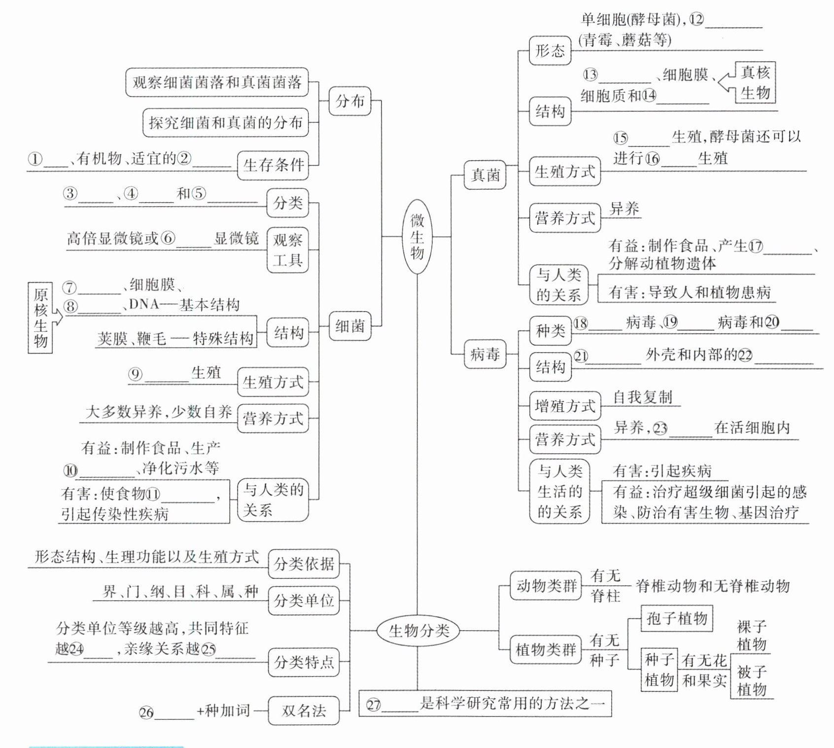 ①水 ②温度 ③杆菌 ④球菌 ⑤螺旋菌 ⑥电子 ⑦细胞壁 ⑧细胞质 ⑨分裂 ⑩胰岛素 ⑪腐败变质 ⑫多细胞 ⑬细胞壁 ⑭细胞核 ⑮孢子 ⑯出芽 ⑰抗生素 ⑱动物 ⑲植物 ⑳噬菌体 ㉑蛋白质 ㉒遗传物质 ㉓寄生 ㉔少 ㉕远 ㉖属名 ㉗调查