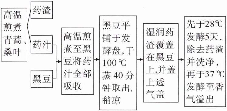 12. (2023赤峰)“小儿豉翘清热颗粒”是专门针对儿童的一种药物,用于小儿风热感冒,其药物成分有淡豆豉。淡豆豉以黑豆成熟的种子为主要原料,辅以青蒿、桑叶发酵而成,其制作过程如图所示,下列叙述正确的是(