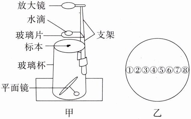 11. 学习了使用显微镜后,生物学兴趣小组的同学尝试进行跨学科实践活动,利用水滴、放大镜、平面镜、透明玻璃杯和可调支架等制作了一台“水滴显微镜”,实现与单目显微镜相似的成像效果。