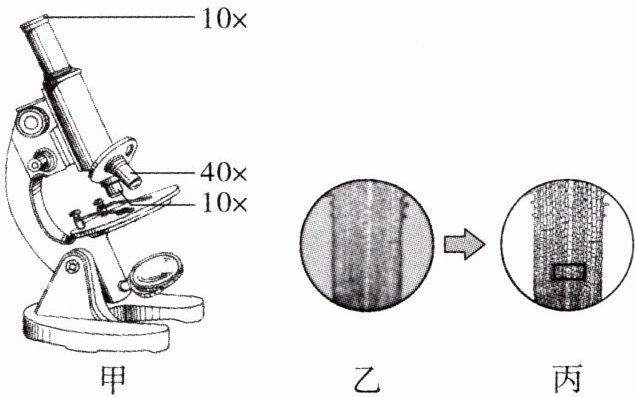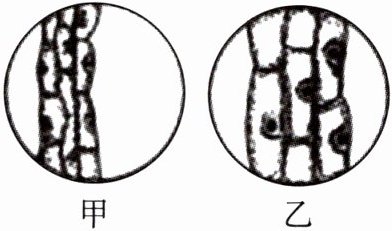 10. 光学显微镜是中学生在生物学实验室里经常使用的仪器。园园同学制作了植物根尖临时装片,放在图甲单目显微镜下观察到图乙、图丙物像。相关叙述正确的是(