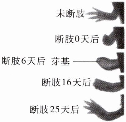 (3)蝾螈断肢 6 天后,在伤口处会形成芽基。某些细胞在形态、结构和生理功能上发生差异性变化,形成肌细胞、神经细胞和骨细胞,这是细胞