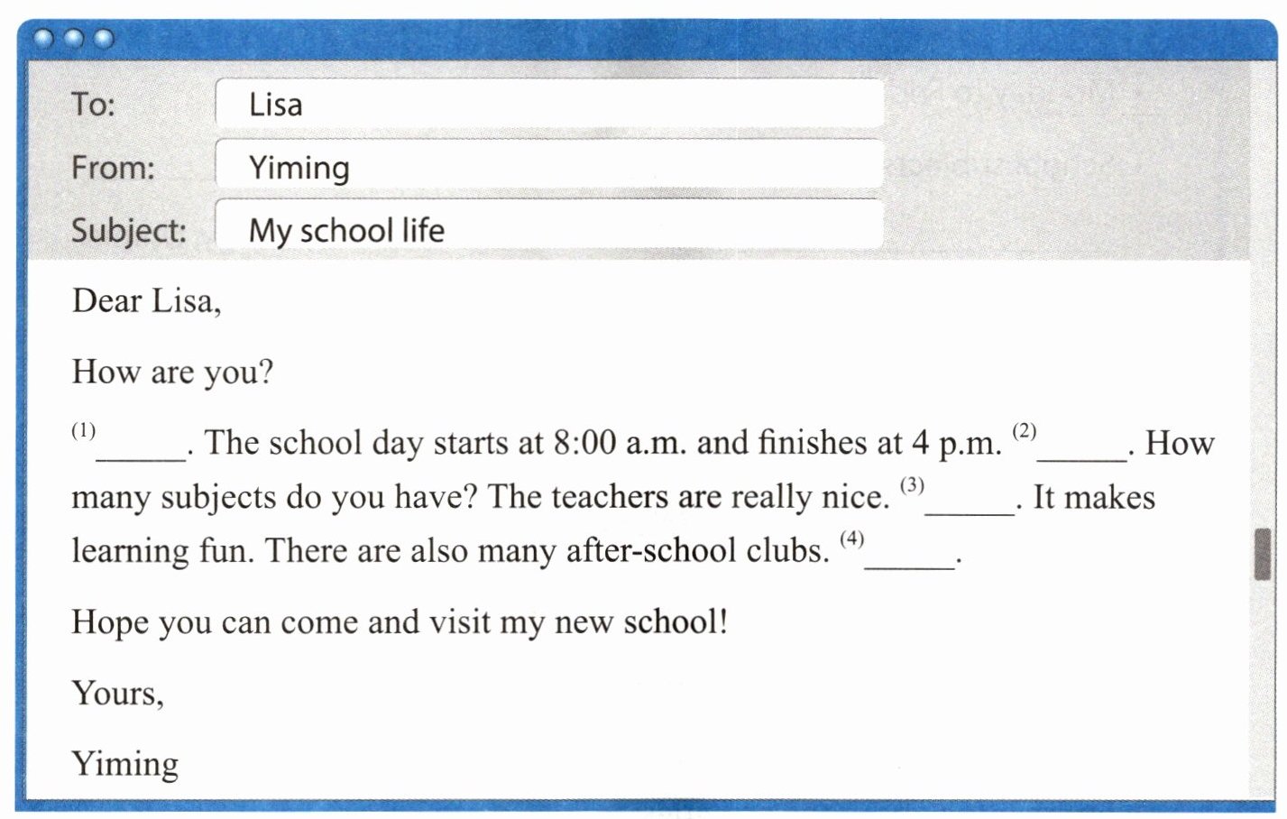 (3) I have eleven school subjects. My favourite ones are English and Science. All subjects are very useful. The lessons are interesting and fun.