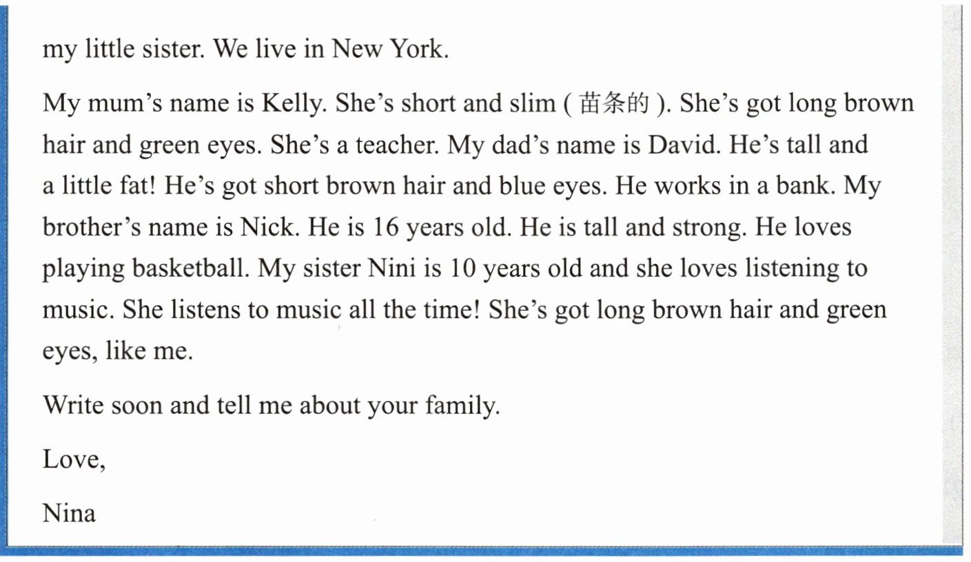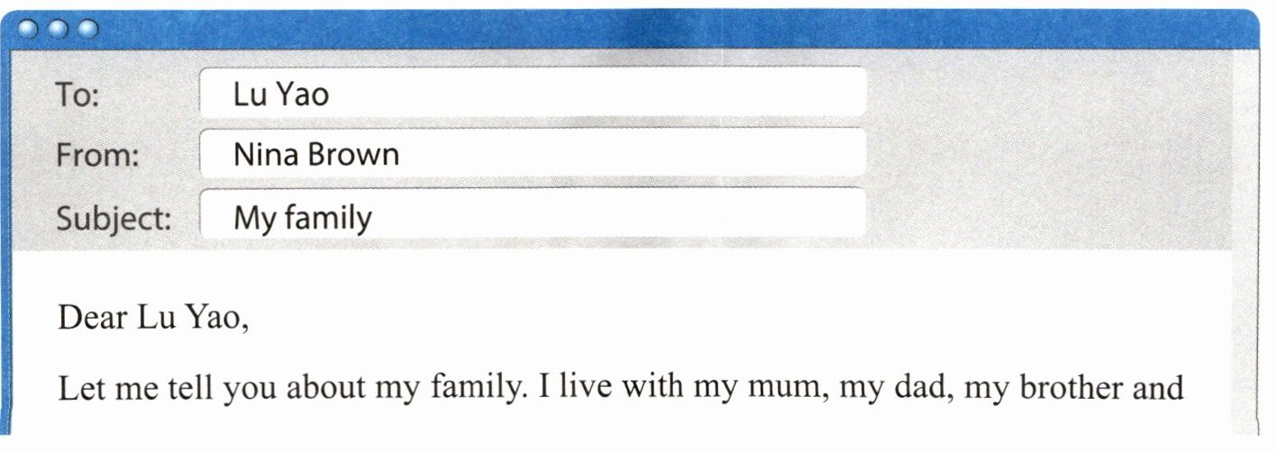 3- 1 What does Nina write about her family? Tick (√) the answer(s). 尼娜写了哪些有关她的家庭的内容?勾选出答案。