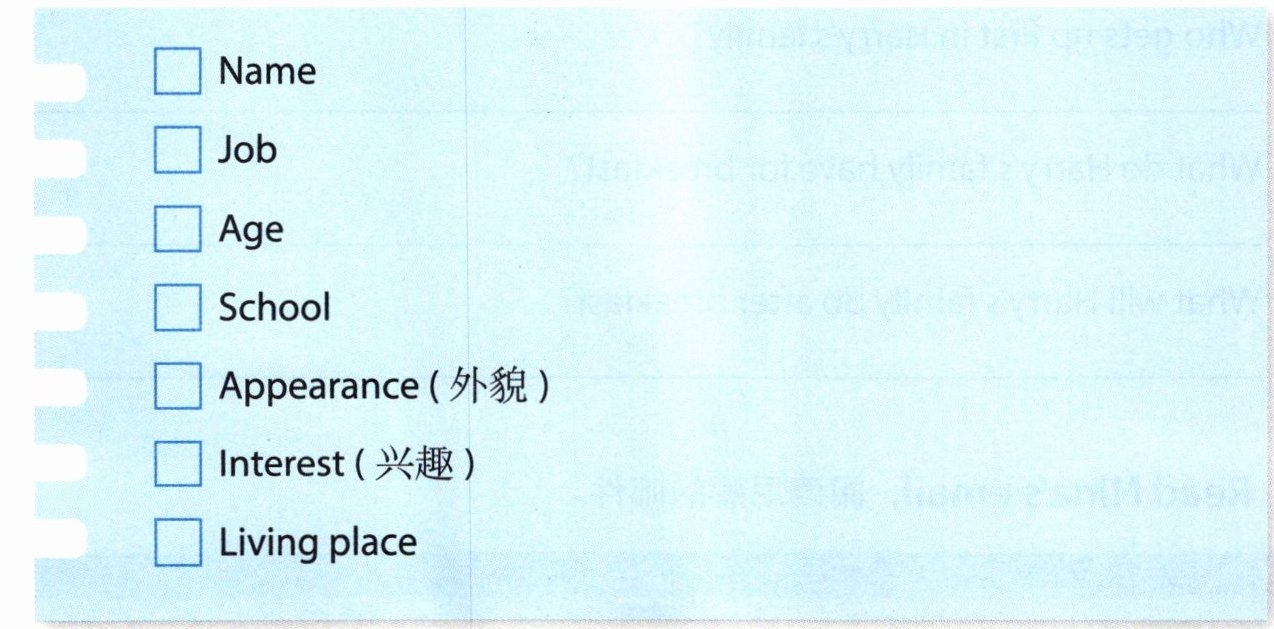 ☑ Name ☑ Job ☑ Age □ School ☑ Appearance (外貌) ☑ Interest (兴趣) ☑ Living place