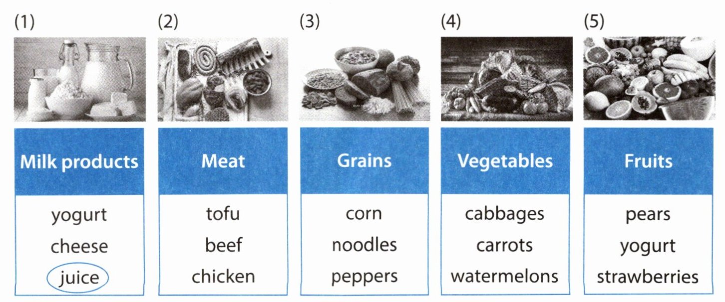 2Read and circle the food item that doesn’t belong to the food group. 阅读并圈出不属于同一食物类别的食物。