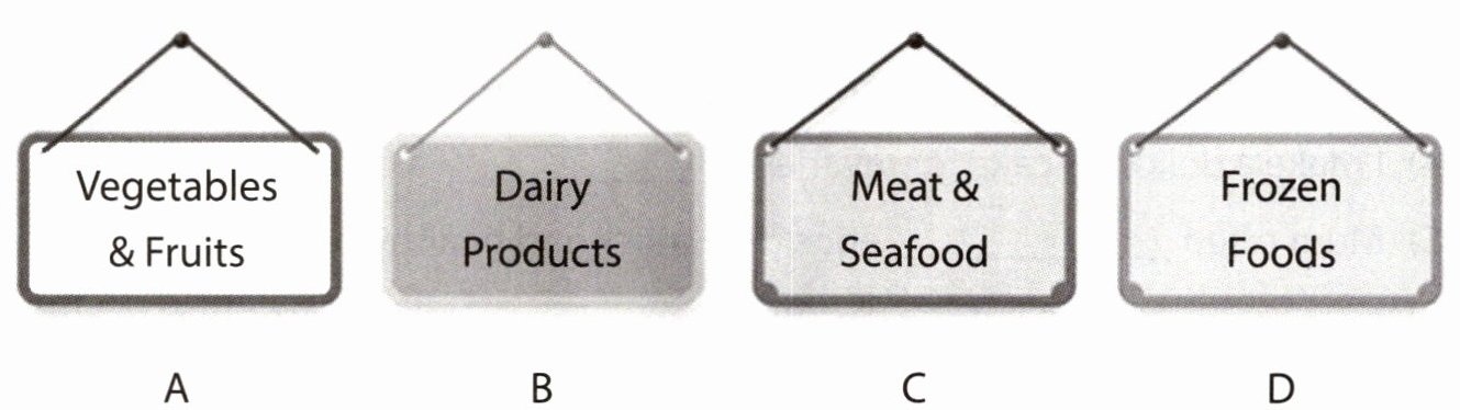 2-2 Which section(s) in the supermarket are they going to buy the foods they need? Circle the answer(s). 他们会去超市的哪些区域购买食物?圈出答案。