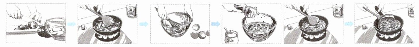 the potatoes, onion, salt and pepper to the eggs and cook the egg mixture (混合物) with some oil. Finally, (4)turn