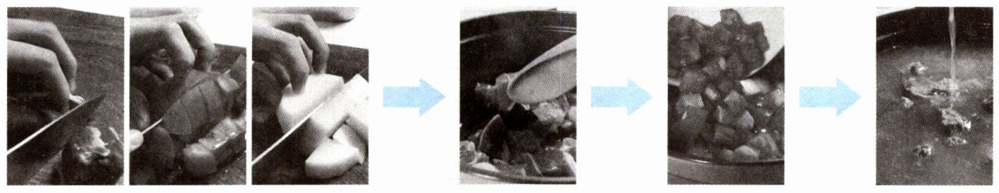 2 Write the four cooking steps of the dish Beef and Tomato Soup according to the pictures. Use proper verbs and signal words. 根据图片,使用恰当的动词和顺序信号词写出 “牛肉番茄汤” 的四个烹饪步骤。