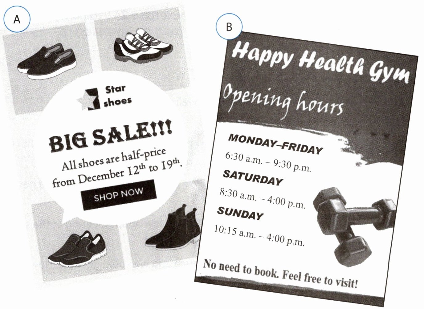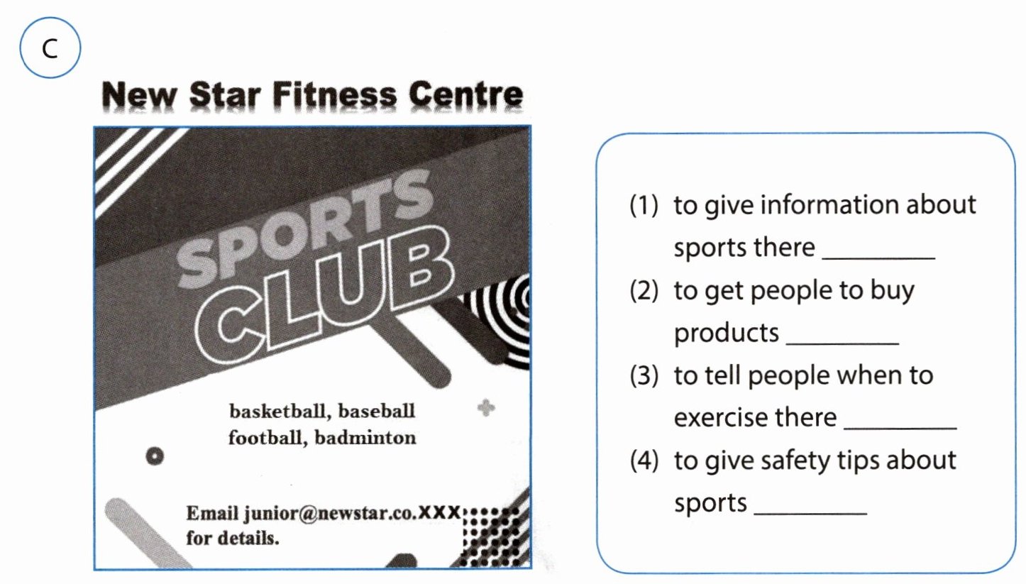 2 - 1 Match the posters with their purposes. There is one extra purpose. 将海报与其用途配对。其中有一个用途是多余的。
