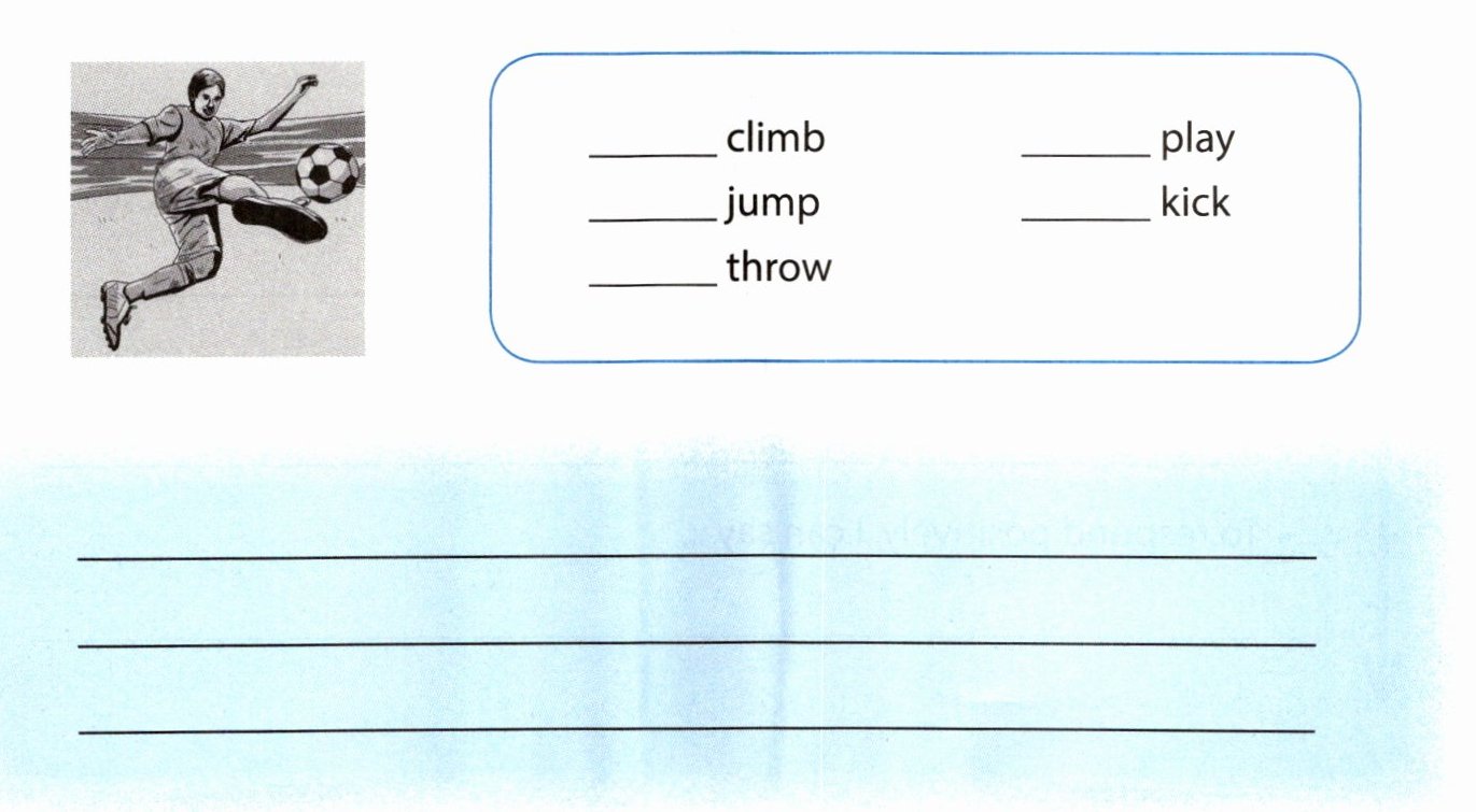2 Tick (√) three verbs from the box that can describe the actions of the person in the picture and then write at least three sentences to describe the picture using the chosen verbs. 从方框中勾选三个可描述图片中人物动作的动词,并用所选动词写至少三句话描述图片。