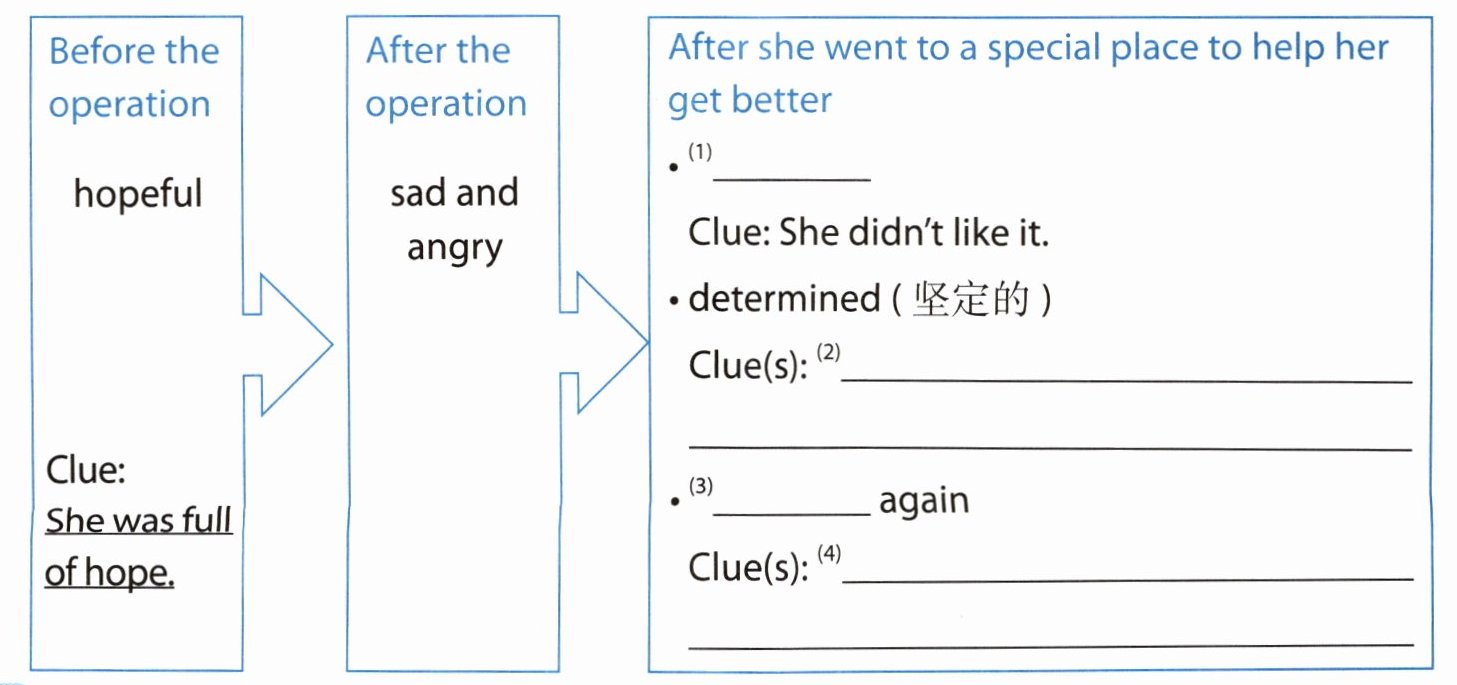 3- 2 How did Sarah feel on her special “journey”? Compele the diagram below. 萨拉在她的这段特别“旅程”中有怎样的情感变化?填写下面的图表。