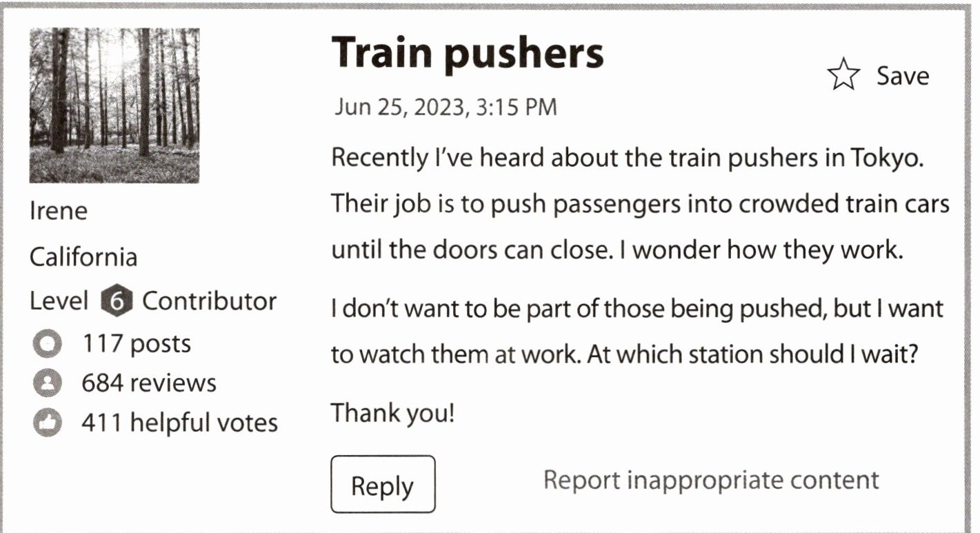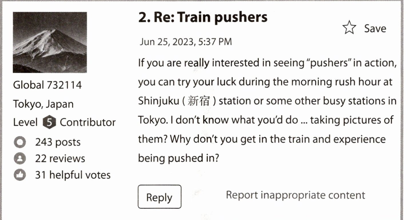 | Level 6 Contributor | Recently I’ve heard about the train pushers in Tokyo. Their job is to push passengers into crowded train cars until the doors can close. I wonder how they work. I don’t want to be part of those being pushed, but I want to watch them at work. At which station should I wait? Thank you! |