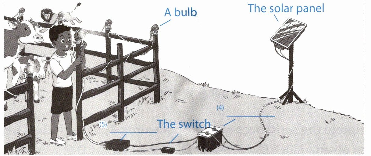 He got an old car battery, an indicator (转向指示灯) box from a motorcycle and a switch (开关). He put bulbs around the fence. The solar panel powered the battery, and the battery powered the indicator box. It then made the bulbs flash on and off just like someone was walking around with a torch.