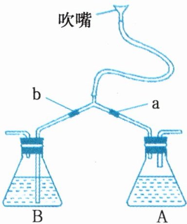 3. 吸气时,捏紧 b 处的胶管,使空气通入右瓶中的石灰水;呼气时,捏紧 a 处的胶管,使空气通入左瓶中的澄清石灰水。