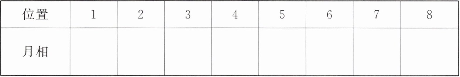 根据教材的方法来模拟月相变化的实验,并画出所见到的8个相应位置的“月相”: