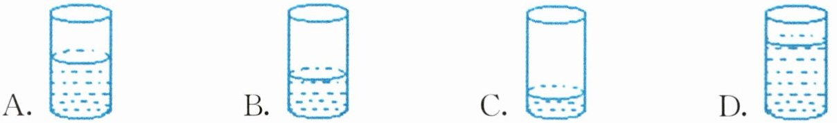 1. 在四个相同的玻璃杯里,分别装有不同量的水,如下图所示,用细棒敲击,能得到 dou、ruai、mi、fa 四个音阶,与音阶 fa 相对应的瓶子是( )。