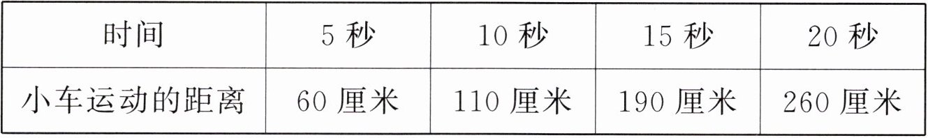 | 小车运动的距离 | 60厘米 | 110厘米 | 190厘米 | 260厘米 |