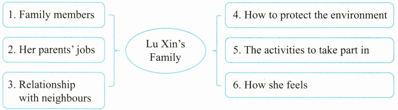( One possible version: ) There are four people in Lu Xin's family, her parents, her sister and she. Lu Xin's parents are both teachers. They are hard-working. Her sister and she study hard at school. Her family are kind and friendly to their neighbours and get on well with them. Besides, Lu Xin's family try their best to protect the environment in their daily life. Her mother and sister go shopping with a shopping bag. Her father goes to work by bike every day. Lu Xin never orders take-away food. Sometimes, Lu Xin's family take part in some volunteer activities together. Lu Xin is proud of her family.