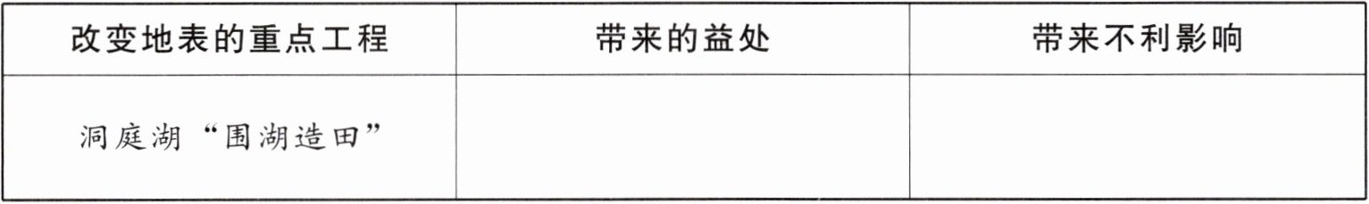人类的活动改变了地表环境的结构。比如,毁林垦种使森林变为农田;城市的建造使森林、草地和农田变为以混凝土为主的地面;过度放牧或开垦使草原变为荒漠;水库的建设使旱地变为水面等。总而言之,人类已经并正在改变地表环境的结构。这些改变有些是会带来益处的,有些则会带来不利影响。请搜集相关资料,整理并完成下表。