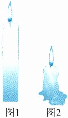 9. 右图是蜡烛燃烧过程的图片。其中图1是蜡烛刚开始燃烧时,图2是燃烧一段时间后。关于燃烧的蜡烛的变化描述正确的是( )。