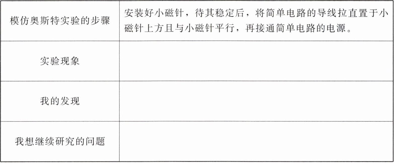 |模仿奥斯特实验的步骤|安装好小磁针,待其稳定后,将简单电路的导线拉直置于小磁针上方且与小磁针平行,再接通简单电路的电源。|