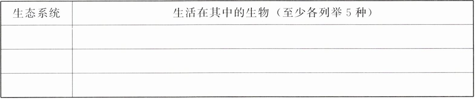 | 生态系统 | 生活在其中的生物(至少各列举 5 种) |