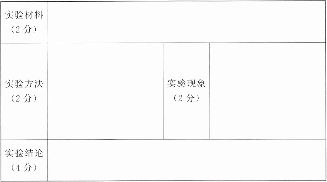 | 实验结论(4 分) | 弯折成拱形并抵住两端的 A4 纸比不加工不变形直接搭成桥面的 A4 纸承重能力强,说明拱形结构能增加物体的承重能力。 |